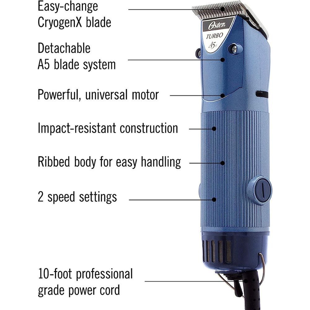 And don't worry about compatibility - Oster A5 Hair Clippers are compatible with Oster A5 detachable Cryogen-X blades, Elite Cryogen-X blades, and replacement blades from the Take Down Quick Wide blade series. You can groom like a pro with Oster A5 dog hair clippers - for dogs!